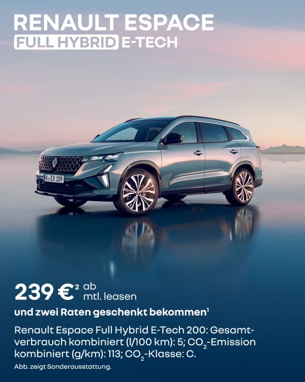 1 Leasing: Renault Espace Techno Full Hybrid E-Tech 200: Fahrzeugpreis: 40.502 €. Leasingsonderzahlung: 5.100 €. Laufzeit: 36 Monate. Gesamtlaufleistung: 30.000 km. Monatsrate: 239 €. Gesamtbetrag: 13.689,71 €. Ein Kilometerleasing-Angebot von Mobilize Financial Services, Geschäftsbereich der RCI Banque S.A. Niederlassung Deutschland, Jagenbergstr. 1, 41468 Neuss, zzgl. Überführungskosten. Gültig für Privatkund/-innen mit Leasingvertrag bis zum 31.03.2026 und Zulassung bis zum 31.12.2026.
