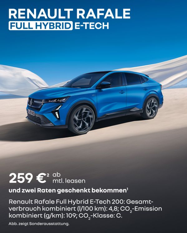 Sichern Sie sich jetzt den Renault Rafale Techno Full Hybrid E-Tech 200 ab 259 €2 monatlicher Leasingrate und erhalten zwei Raten geschenkt1.