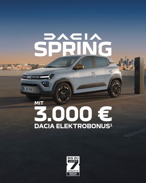 ¹ Elektrobonus i.H.v. 3.000 € (Brutto) von DACIA für Privatkunden und Kleingewerbe bei Leasing oder Finanzierung eines Dacia Spring Neuwagen über Mobilize Financial Services. Gültig im Zeitraum vom 01.01.2026 bis zum 31.03.2026 (solange der Vorrat reicht) und Zulassung vom 01.01.2026 bis 31.12.2026. Der Dacia Elektrobonus wird in das Leasing- oder Finanzierungsangebot einkalkuliert. 2.500 € Dacia Elektrobonus bei Barkauf. Der Elektrobonus von Dacia ist unabhängig von der Gewährung der staatlichen Elektroprämie (Ausstattung Essential aktuell nicht mehr verfügbar).