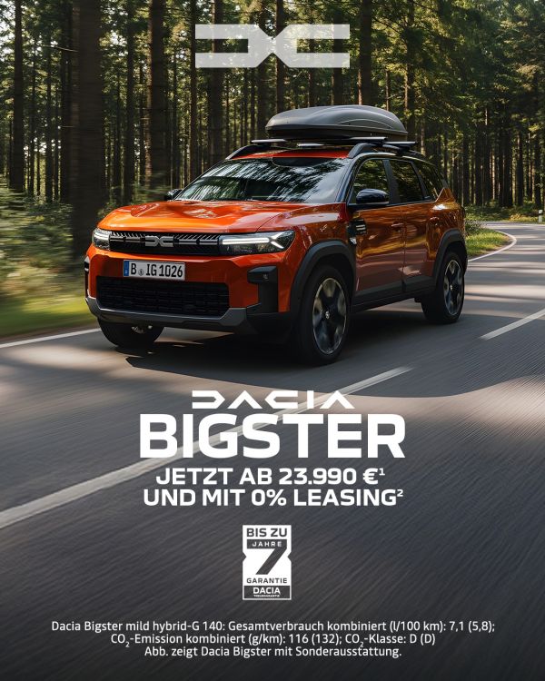 Dacia Bigster mild hybrid-G 140: Gesamtverbrauch kombiniert (l/100 km): 7,1 (5,8); CO2-Emission kombiniert (g/km): 116 (132); CO2-Klasse: D (D).