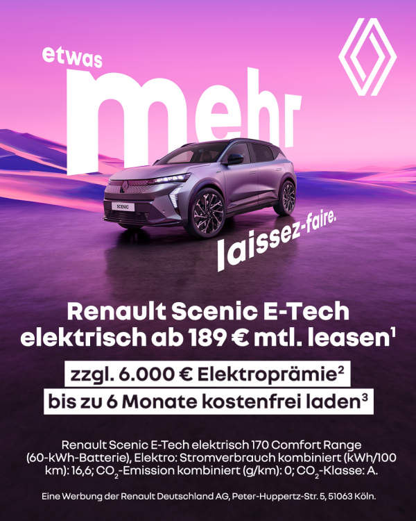 ¹Leasing: Renault Scenic E-Tech elektrisch 170 Comfort Range: 30.774 €. Leasingsonderzahlung: 4.000 €. Laufzeit: 48 Monate. Gesamtlaufleistung: 40.000 km. Monatsrate: 189 €. Gesamtbetrag: 13.033 €. Ein Kilometerleasing-Angebot von Renault Financial Services, Geschäftsbereich der RCI Banque S.A. Niederlassung Deutschland, Jagenbergstr. 1, 41468 Neuss, zzgl. Überführungskosten. Gültig für Privatkund/-innen mit Leasingvertrag bis zum 31.03.2026 und Zulassung bis zum 31.12.2026. Bei allen teilnehmenden Renault Partnern.
