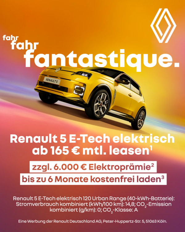 ¹Leasing: Renault 5 E-Tech elektrisch Evolution 120 Urban Range: Fahrzeugpreis: 23.618 €. Leasingsonderzahlung: 4.000 €. Laufzeit: 48 Monate. Gesamtlaufleistung: 40.000 km. Monatsrate: 165 €. Gesamtbetrag: 11.873 €. Ein Kilometerleasing-Angebot von Mobilize Financial Services, Geschäftsbereich der RCI Banque S.A. Niederlassung Deutschland, Jagenbergstr. 1, 41468 Neuss, zzgl. Überführungskosten. Gültig für Privatkund/-innen mit Leasingvertrag bis zum 31.03.2026 und Zulassung bis zum 31.12.2026. Bei allen teilnehmenden Renault Partnern.